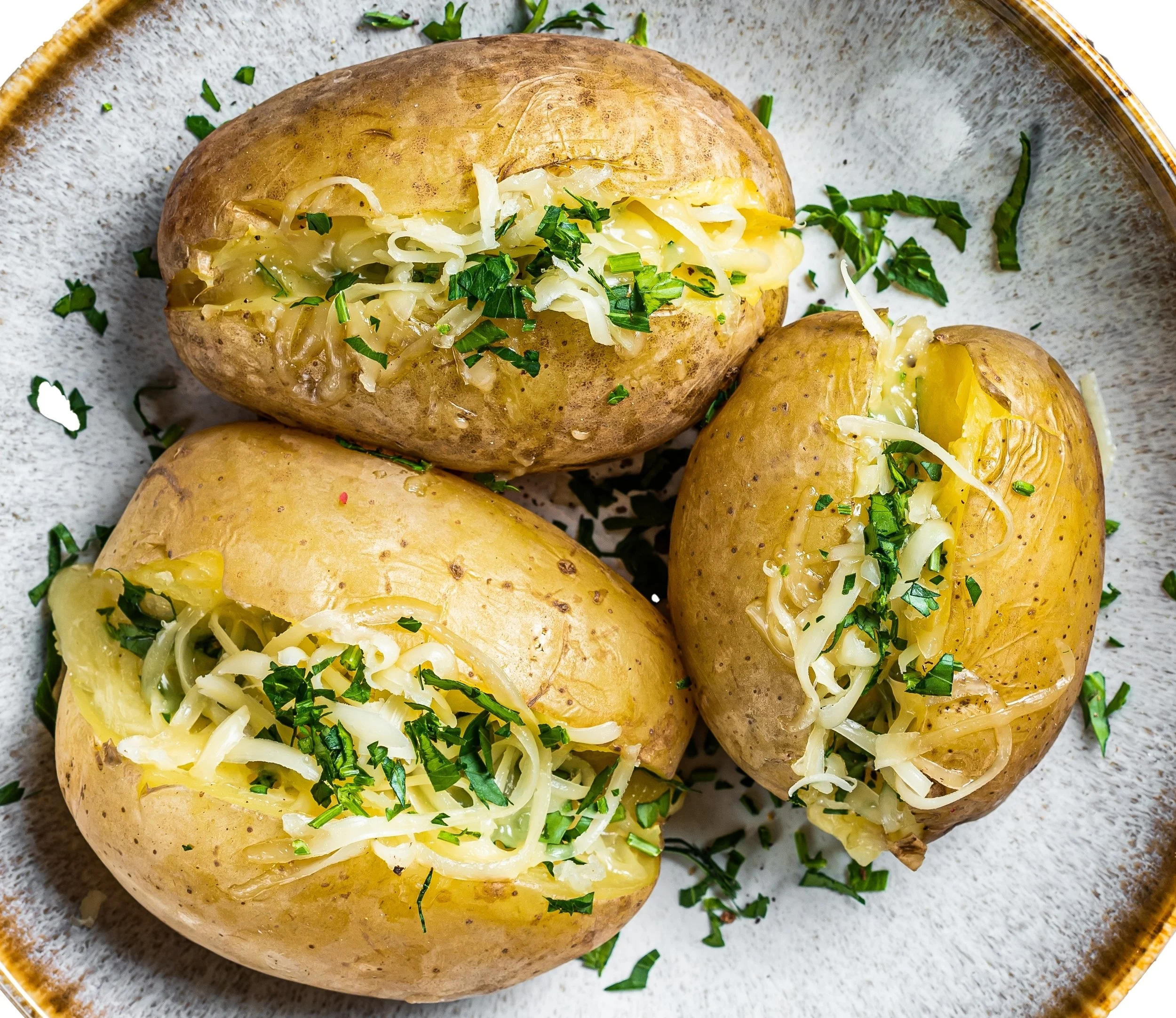 Bake or microwave russet potatoes until tender, then slice open and fluff with a fork. Stir in butter and shredded McCall’s Cheddar, then top with more cheddar and pop under the broiler until bubbly. Finish with green onions, bacon bits, or roasted broccoli for a full meal.