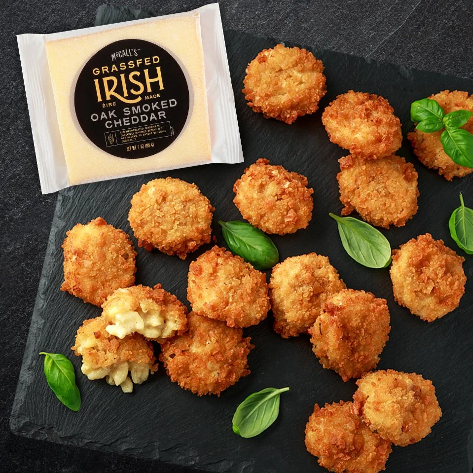 Mix mac and cheese with shredded McCall’s Oak Smoked Grassfed Cheddar. Roll into 2 tbsp balls and freeze for 15–20 minutes.